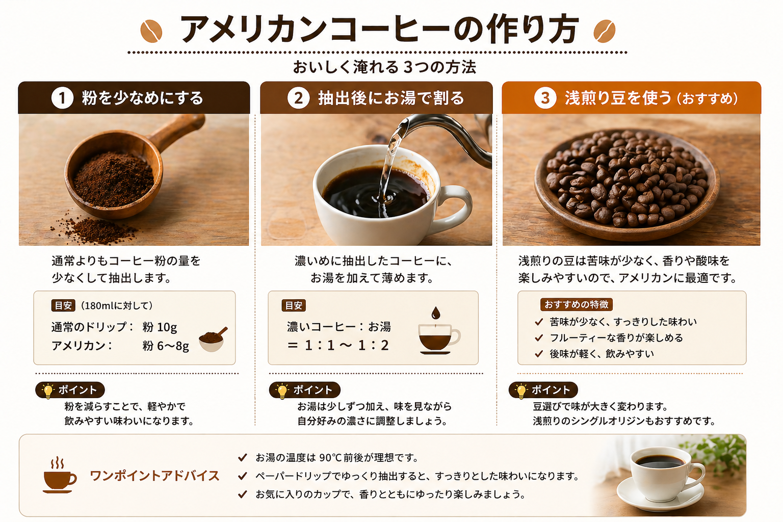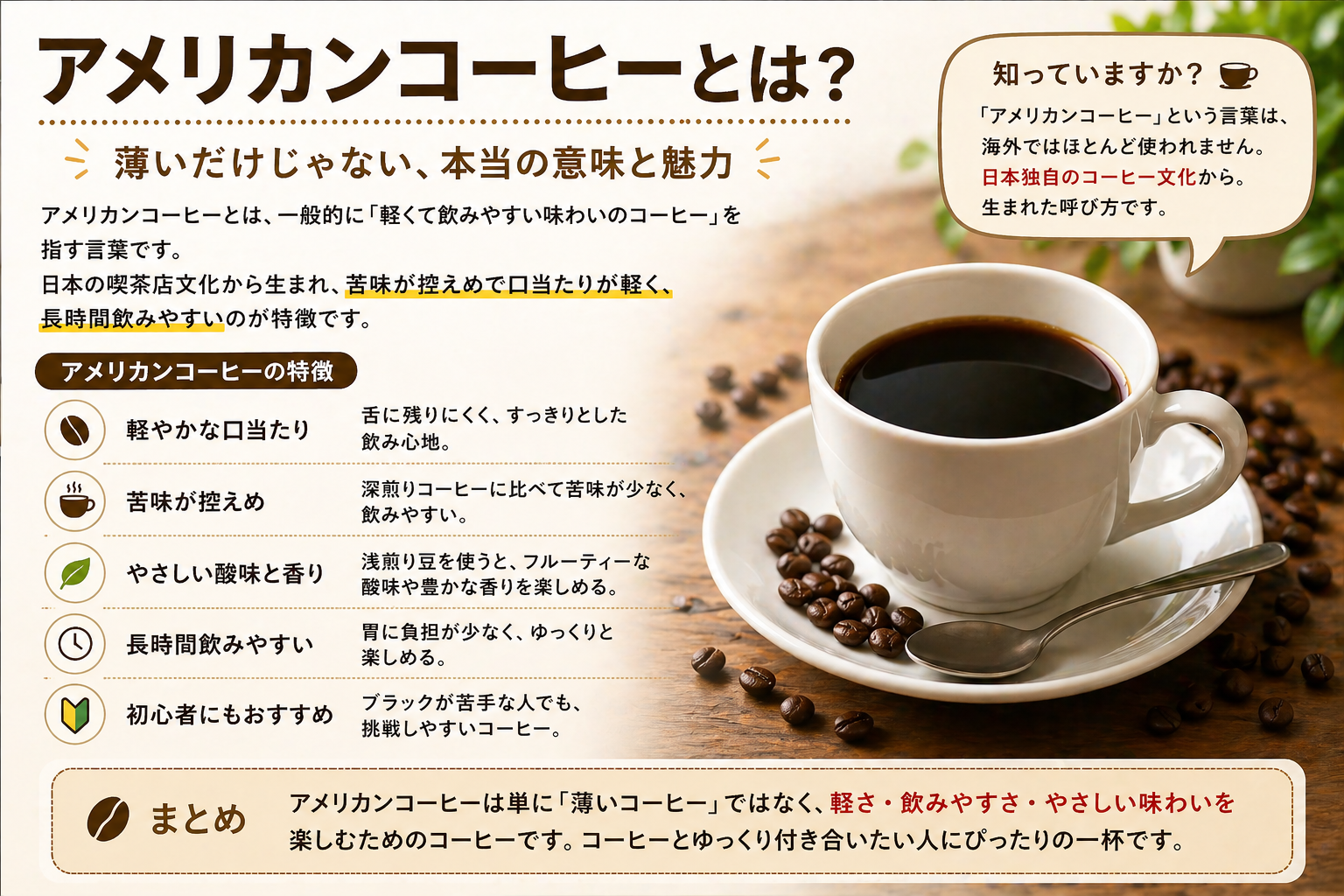 アメリカンコーヒーは単に「薄いコーヒー」ではなく、 日本独自に発展したコーヒー文化と、 本来のアメリカのコーヒー事情が組み合わさって生まれた存在です。