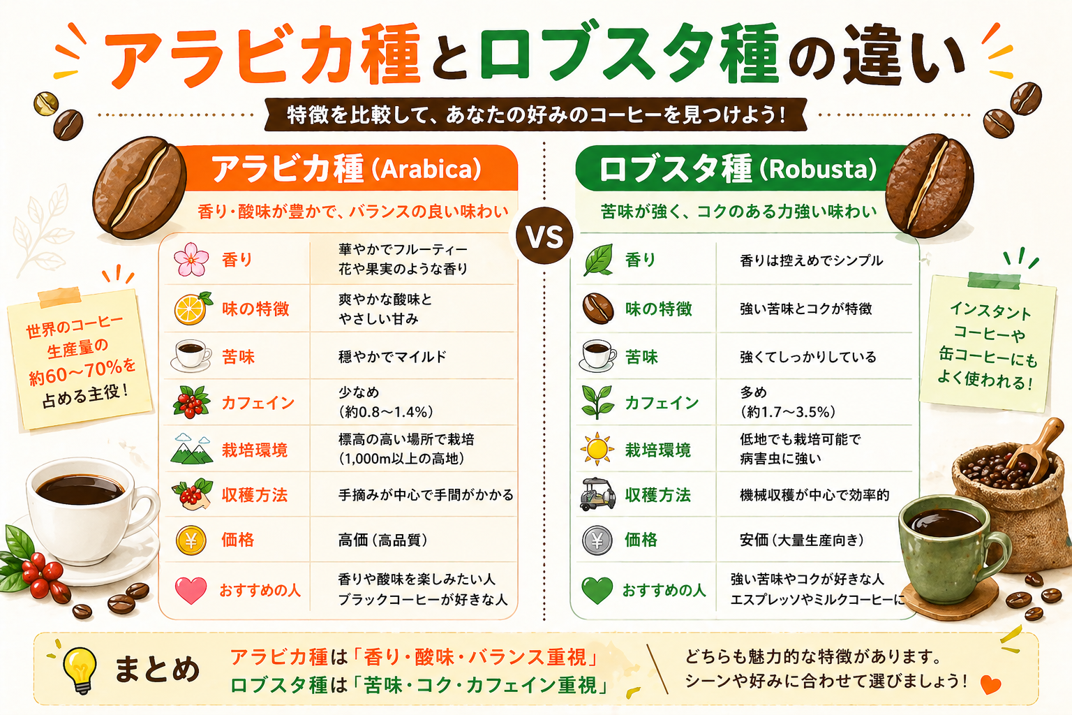 この記事では、アラビアコーヒーの正確な意味から、アラビカ種の特徴、味・香り・成分、ロブスタ種との違いまで詳しく解説します。