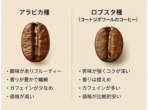 コートジボワールのコーヒーを理解するうえで、アラビカ種とロブスタ種の違いは重要です。